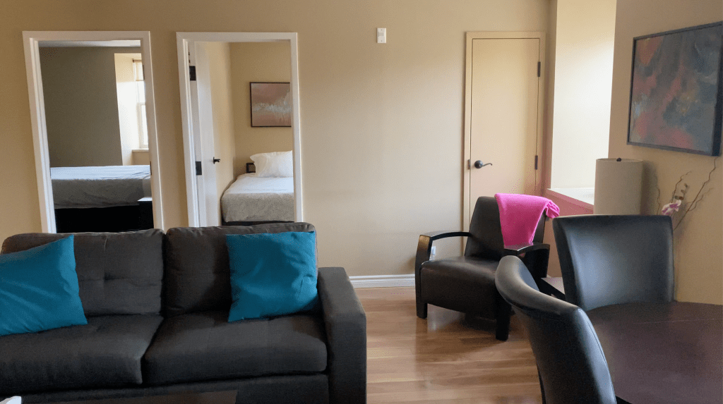 All of our gorgeous units are completely furnished with modern décor, and equipped with full kitchens. All housewares and utilities are provided. Every unit has hardwood flooring, and bright windows throughout the suite. Basic expandable cable and high speed Internet are available in all units as expected in this technological hub. All units have free parking. All units are equipped with individually-controlled heat and air conditioning.